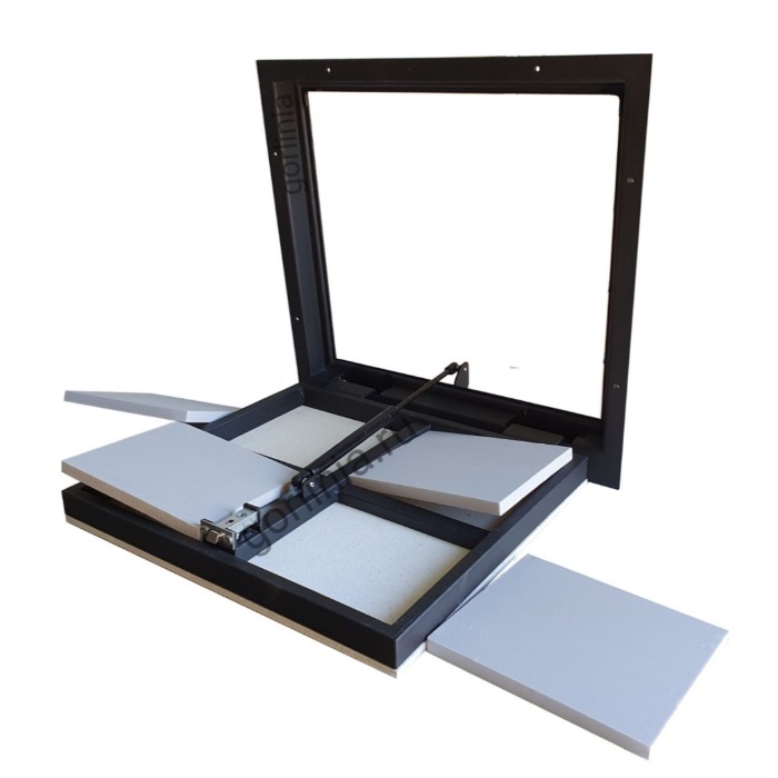 Облегченная коробка из формованного листа 3 мм с наличником для непроходных мест дома. Жесткая створка из профиля 30х20 обшита гипсоволокнистым влагостойким листом под наклейку плитки.