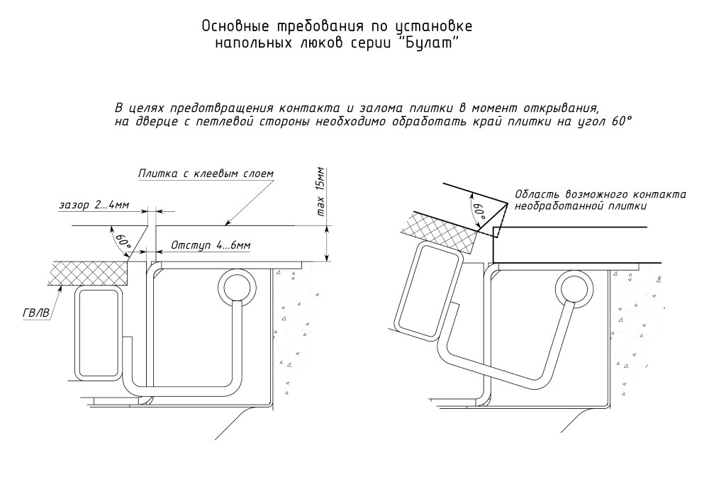 Продуманная схема скрытой установки посадочной части коробки 1200х700 в подготовленное посадочное отверстие в нулевую отметку пола. Облицовка примыкающего по периметру стального обрамления и ГВЛ полотна керамогранитом, плиткой (настил ламината) с эффектом невидимки.