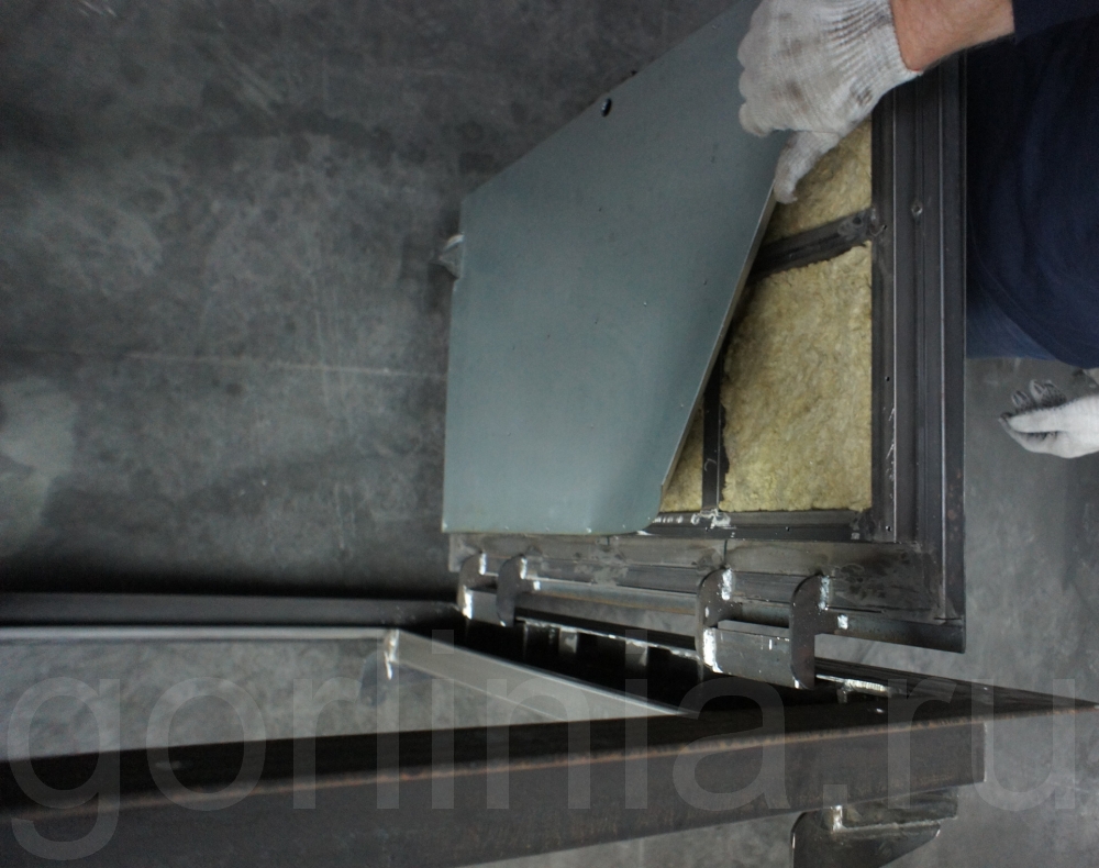 Люк выполнен в раме из уголка толщиной стенки 5 мм. Установка производится методом погружения в напольный проем 600*900 мм. Петли расположены по стороне 900 мм. Внешний габарит уголка рамы составит 715х1015 мм. Отметим, что проём в свету для спуска в подвал составляет: 440х850 мм.